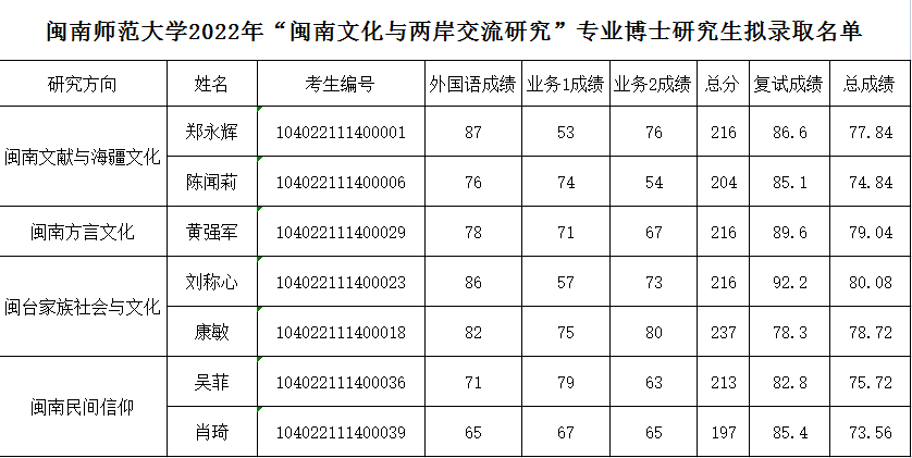 2022年“闽南文化与两岸交流研究”专业博士研究生拟录取名单经校研究生招生工作领导小组审定,现进行公示,公示期十个工作日(2022年4月29日-2022年5月13日)。考生如对公示情况有任何疑问,可在公示期间向我校学科建设与研究生工作处来电来信反应。电话:0596-2527801(工作日上班时间接听),邮箱xyczsk@mnnu.edu.cn。