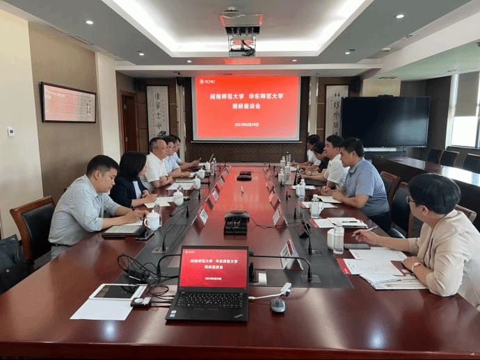 在华东师范大学调研座谈会上,双方围绕师范生人才培养、智能科学与技术和区域国别学学科建设和人才培养开展深入交流。张龙海表示,学科交叉融合和交叉学科建设要依托现有学科优势,凝练的研究方向和领域契合国家重大战略需求,按照国家急需、特色、前沿、冷门的要求,同时不断深入推进学科专业调整,华师的探索和实践给我们提供了宝贵经验,尽快消化、转化和内化成推动发展的不竭动力,不断提升我校学科建设和人才培养质量。